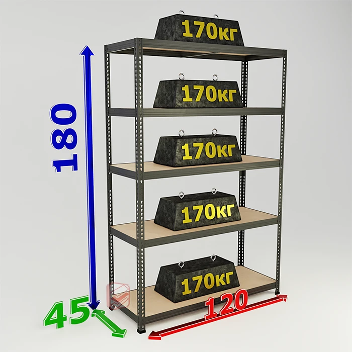 ✔ Надежная конструкция – выдерживает до 170 кг на полку и 750 кг на весь стеллаж.